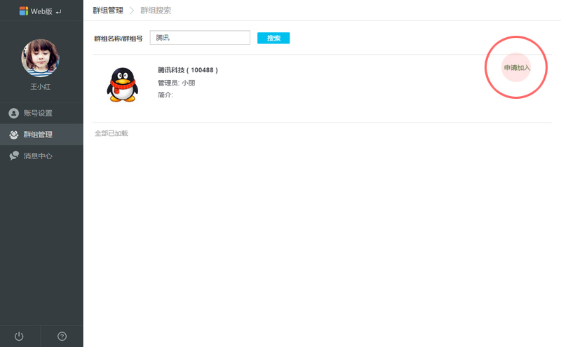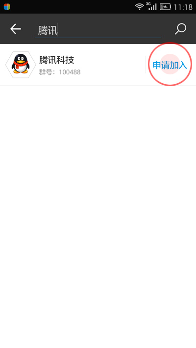 3.在打开[搜索群组]界面。搜索要加入的群组的名称或群组号(向管理员索要),在搜索结果中点击[申请加入]按钮,群组管理员审批后,你就加入群组了。