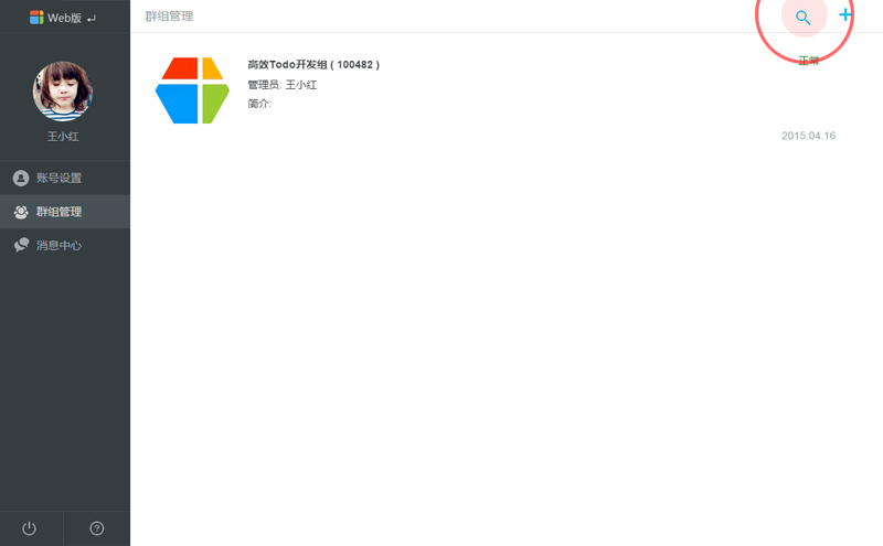 2.在打开的[群组管理]界面,点击右上角的[ 搜索 ]按钮,就可以打开搜索群组界面