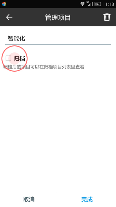 2.在打开的[管理项目]界面,点击[归档]复选框。就可以把这个项目归档了