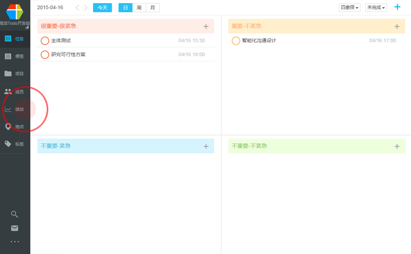 目前只在Web端提供了查看群组绩效的方式。在高效Todo网页版,点击[绩效]按钮,就可以查看群组成员的绩效了。